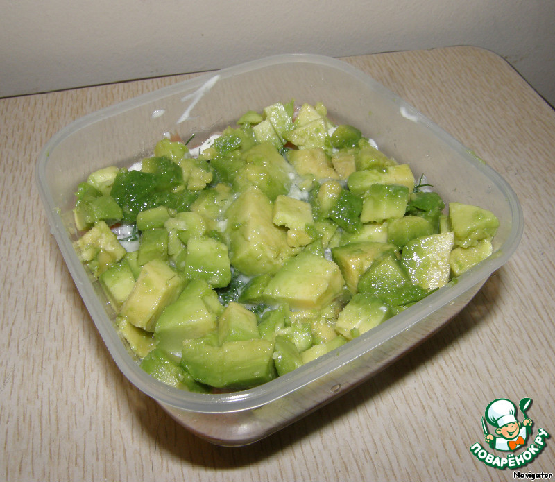 Следующий слой - авокадо. Все слега посолите и полейте соком лайма или лимонным соком.