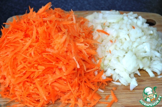 Морковь почистить и натереть на крупной тёрке. Лук почистить и мелко порезать.