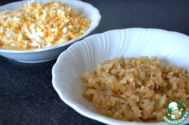Яйца сварить вкрутую, почистить и потереть на крупной тёрке. Лук обжарить в маленьком количестве масла, (я обжариваю в масле, от рыбных консерв).