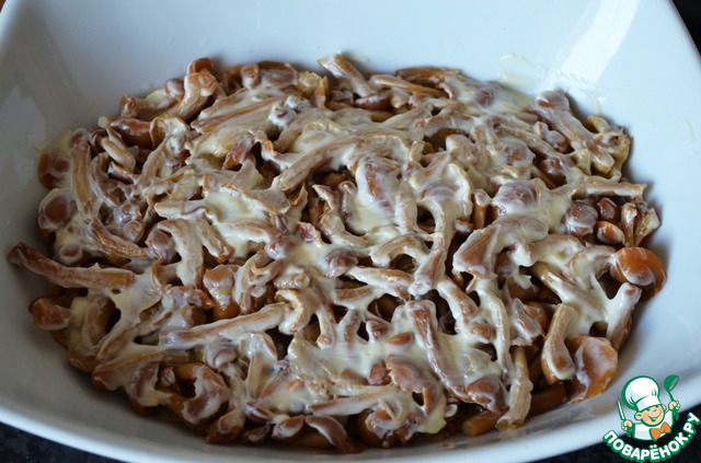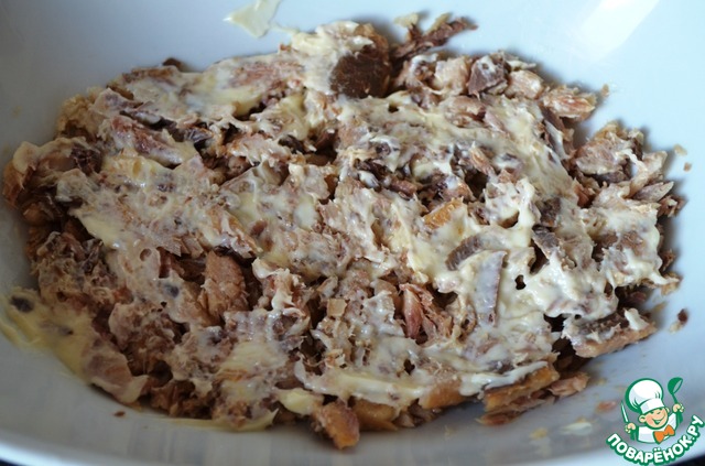 Первым слоем идёт консерва, сверху смазать немного майнезом.