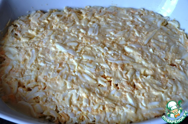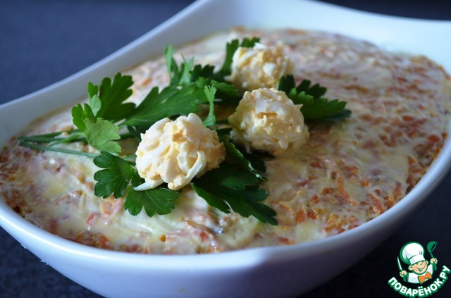 Последний слой жареная морковь и майонез! Этот слой, можно промазать чуть-чуть больше, чтобы морковь не сохла.