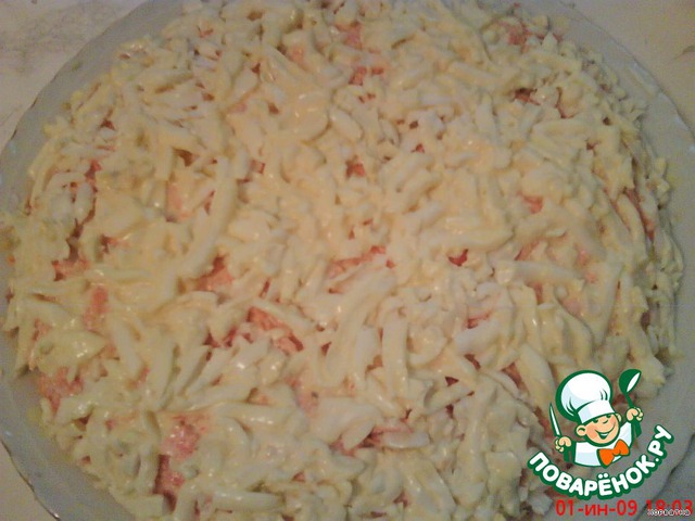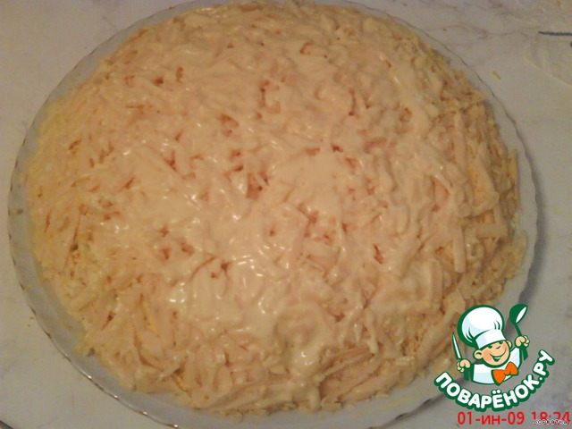 Шестой слой - яичные желтки, натертые на крупной терке.