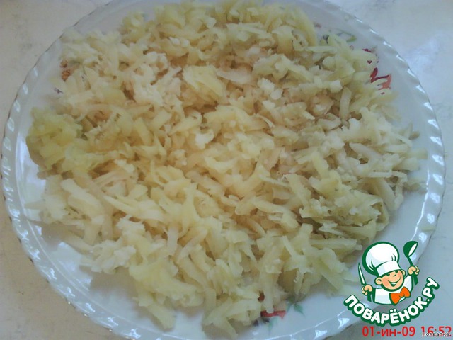 Первый слой - натираем картофель на крупной терке. Немного подсолить.