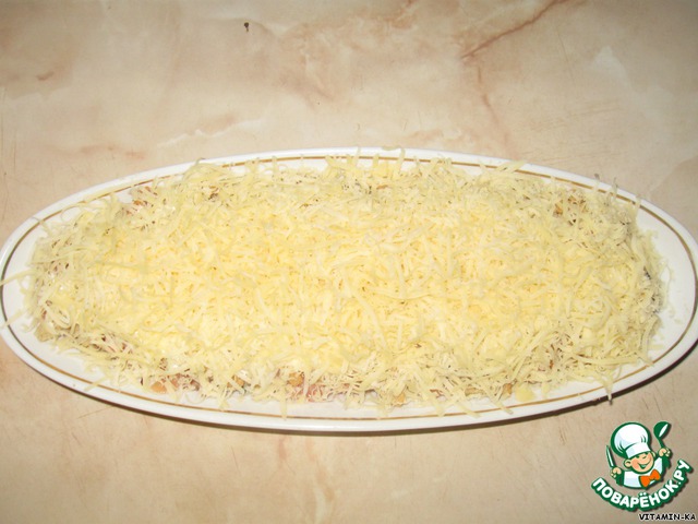 3 слой: на мелкой терке натереть сыр, обильно смазать майонезом.