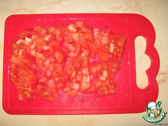 4 слой: помидор порезать на мелкие кубики (можно воспользоваться ситом, чтобы лишняя жидкость с помидора стекла).
