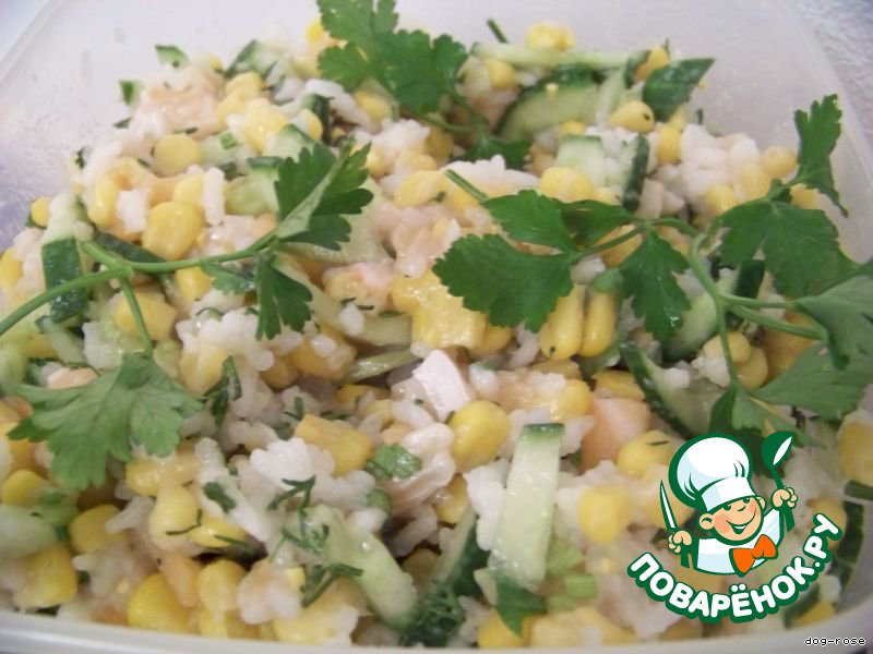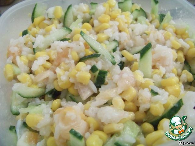 Добавляем рис. Количество – 1 стакан – указано для уже отваренного риса. Выкладываем кукурузу из банки, перемешиваем.