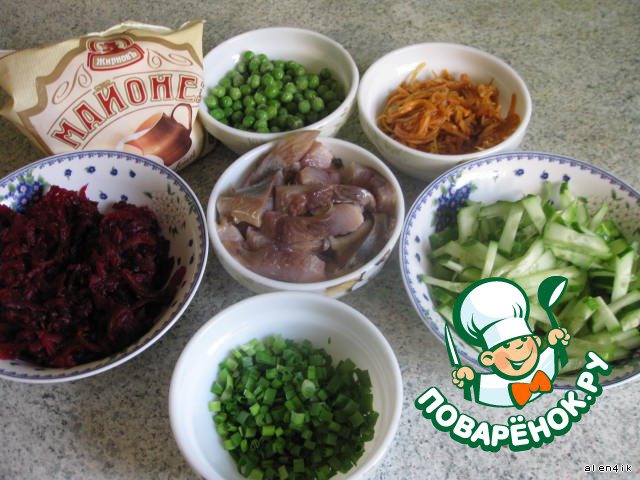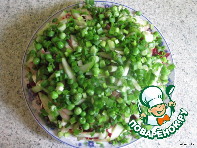 | Очень яркий и вкусненький получился салатик из корейской морковки, вареной свеклы, сельди, свежего огурчика, зеленого лучка и горошка. |