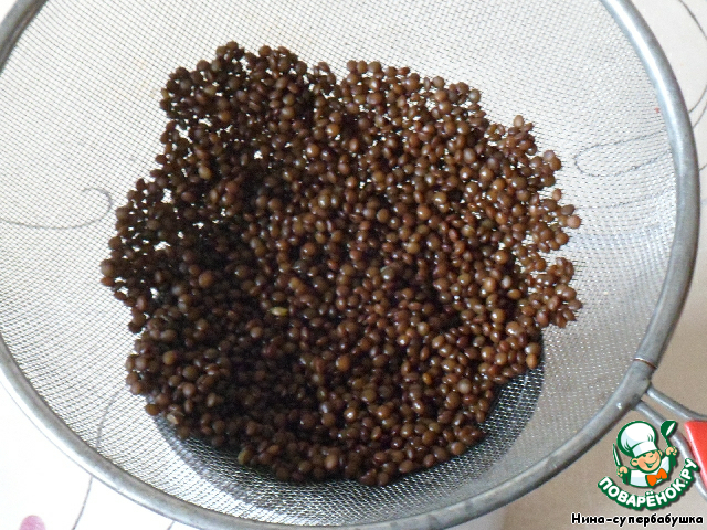 Чечевицу промыть и сварить в подсоленной воде в течение 20 минут. Слить, промыть холодной водой и обсушить. Смешать 2 ст.л. масла и 1 ст.л. лимонного сока и небольшим количеством заправить чечевицу.