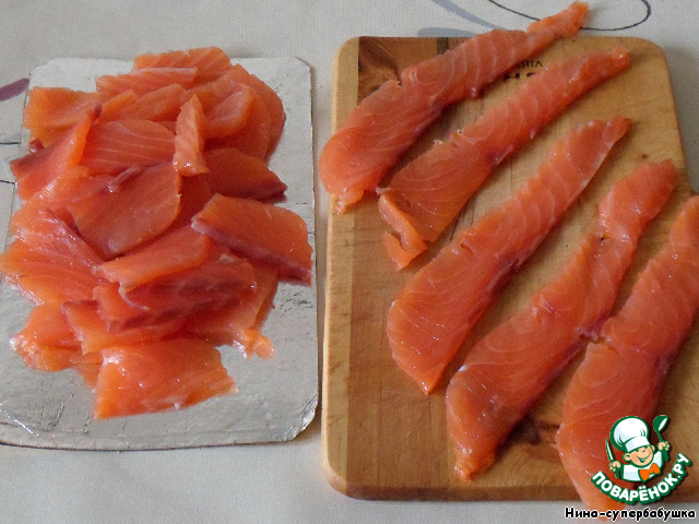 От рыбки отрезать несколько длинных тонких полосок для украшения, остальную рыбку нарезать тонкими ломтиками.