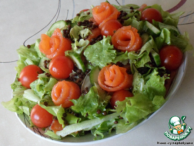 В большой широкой миске аккуратно и легко смешать салат, огурец, чечевицу, лук с чесноком и рыбу. Выложить на блюдо. Сверху разложить помидорчики. Из длинных полосок рыбы свернуть розочки и выложить на салат. Сверху полить остатками заправки.