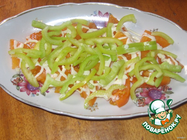 Перец болгарский режем дольками, выкладываем на помидоры, майонез - сеточка.