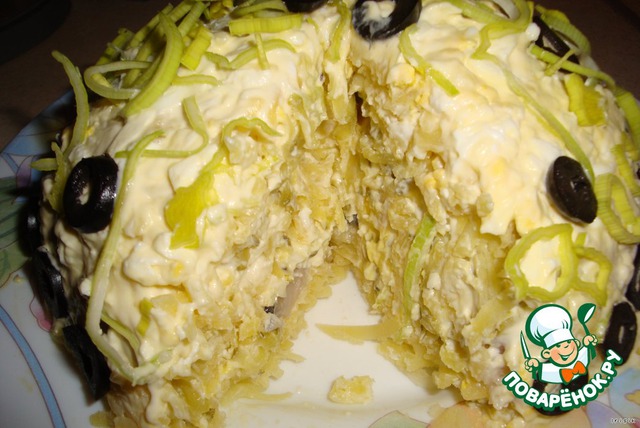Салат украсить луком - пореем, нарезанным соломкой, и маслинами.