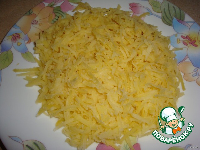 3-й слой: плавленый сырок, натертый на крупной терке.