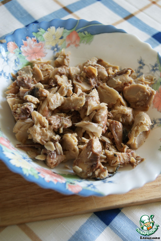 Итак! С рыбы сливаем жидкость, удаляем косточки и разделяем ее на кусочки