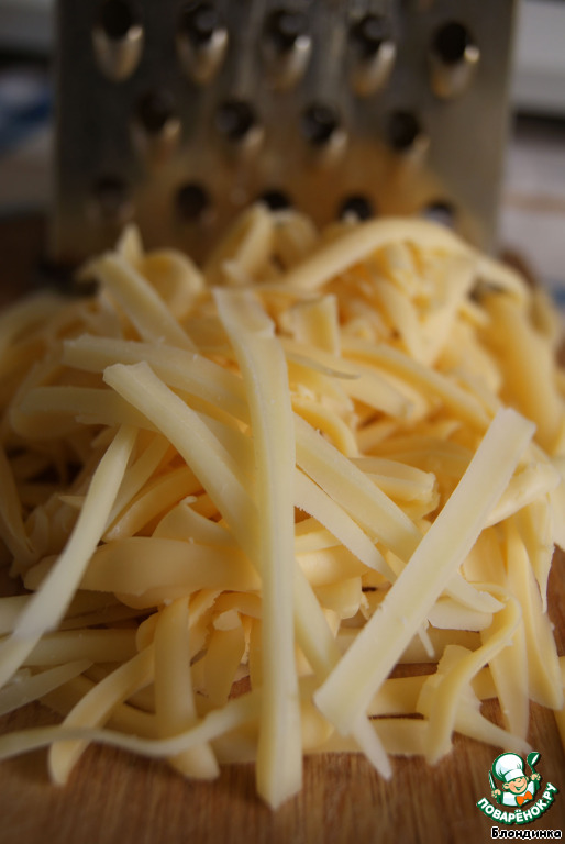 Сыр (у меня был напополам примерно "Российский" и пармезан) натираем на крупной терке. Я натерла вот такими длинными "полосками"