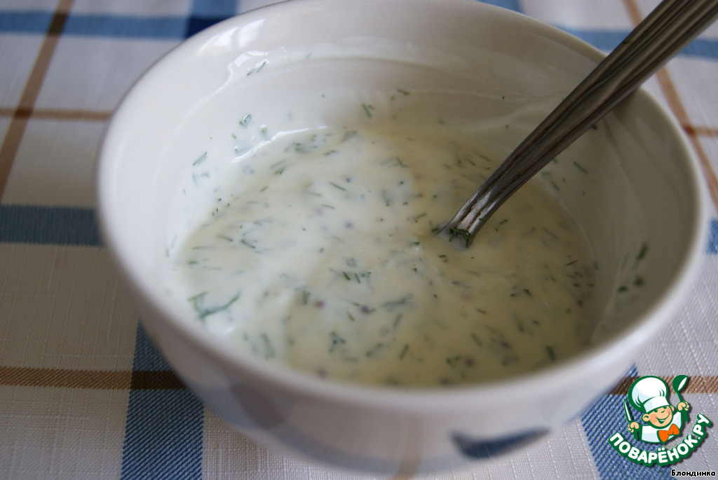 Для заправки смешиваем натуральный йогурт и чайную ложку горчицы, добавляем мелко нарезанную зелень (у меня это укроп)