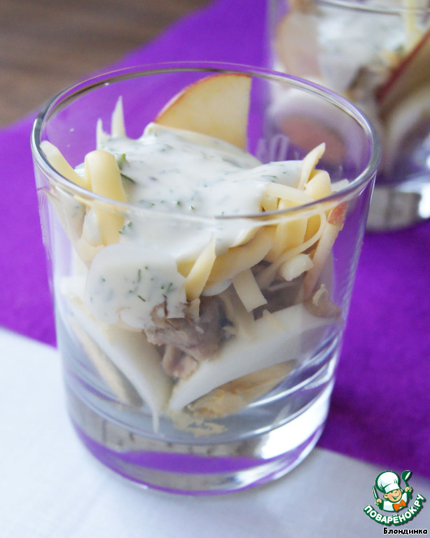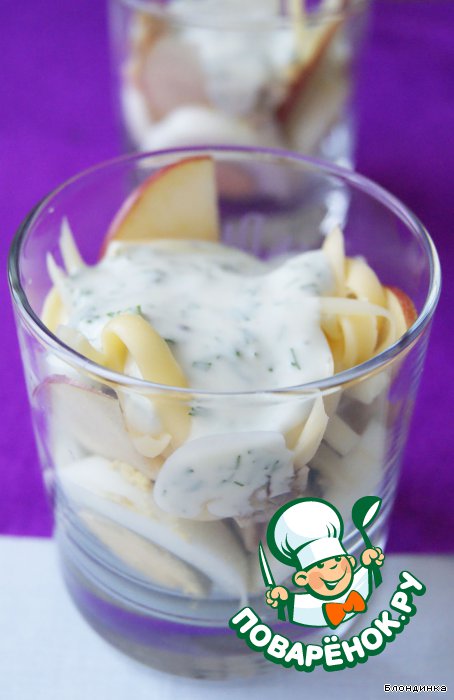 Сразу оговорюсь, в оригинале салат был в слоеном формате с майонезом. Мне кажется, это тяжеловато и как-то по-зимнему, что ли. Поэтому предлагаю изменить форму подачи и сделать салат более легким.