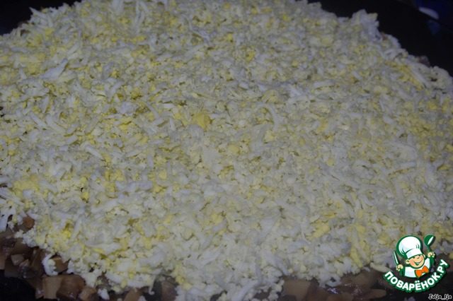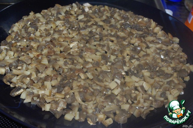 Далее, выкладываем салат слоями. Первый слой, мелко нарезанные грибы.