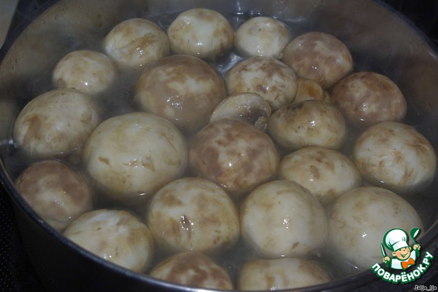 Грибы отвариваем в кипящей воде, с добавлением соли и специй на Ваш вкус. Отвариваем целиком, чтобы были более сочные.