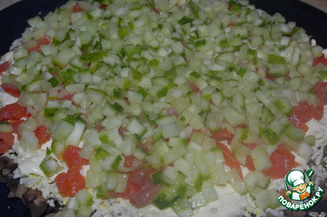 Огурцы нарезаем кубиками. Это следующий слой. Можно немного посолить - по вкусу.