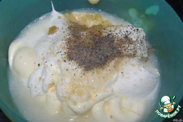 Для соуса смешиваем майонез, сметану, лимонный сок и чёрный перец.