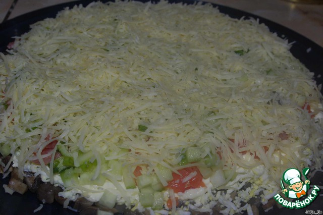 На огурцы выкладываем натёртый сыр. Смазываем оставшимся соусом.