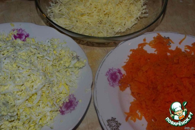 В отдельную посуду, натираем на мелкой тёрке сыр, яйца и морковь.