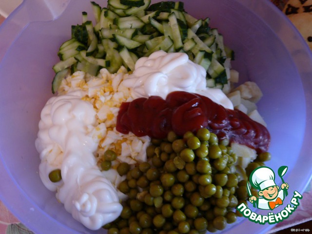 Все – в миску, добавить горошек, майонез, кетчуп, посолить, поперчить и перемешать.