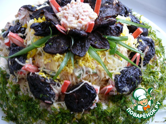 Салат выложить в форме двухъярусного торта и украсить фаршированным черносливом.
