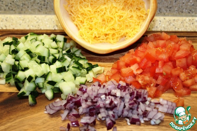 Огурцы и помидоры нарезала мелкими кубиками, лук мелко порубила, сыр натерла на средней терке.