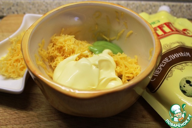 Приготовила сырный соус: в натертый сыр (немного отложила) добавила майонез "Махеевъ" с перепелиным яйцом, оливковое масло, васаби (будьте осторожны, острая штучка), немного подсолила.