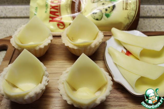 Ломтики сыра разрезала на две части и выложила ими дно тарталеток, оставшиеся два кусочка свернула кулечком.