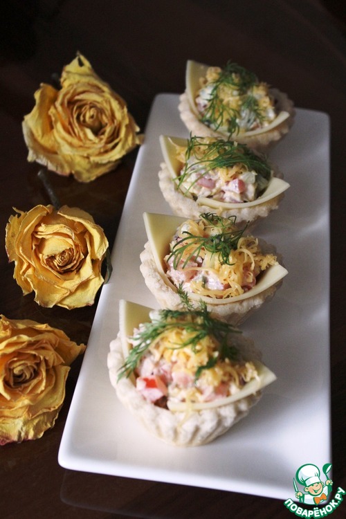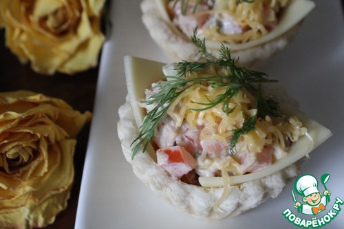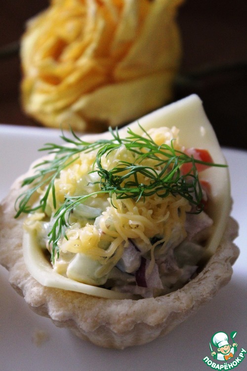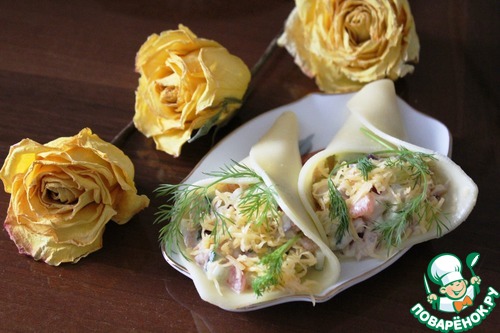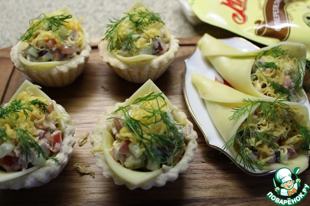 Заполнила получившиеся формочки и кулечки салатом, сверху посыпала отложенным сыром, украсила укропом. Вот и готово, можно угощаться.