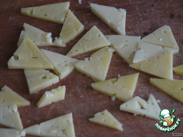 Сыр режем на тоненькие треугольники.