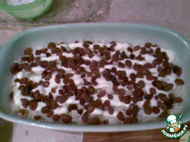 Затем выкладываем промытый, предварительно замоченный и отжатый изюм.