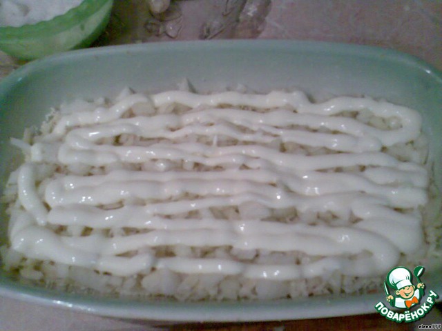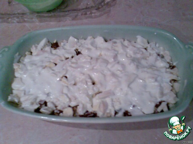 Сверху выкладываем рубленые яйца и смазываем сметаной.