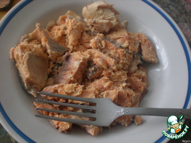 С рыбки сцедим сок и разомнём её вилкой не очень мелко.
