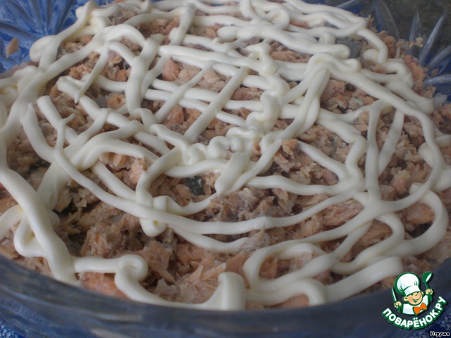 Теперь рыба. Этот слой смазываем половиной имеющегося у нас майонеза.