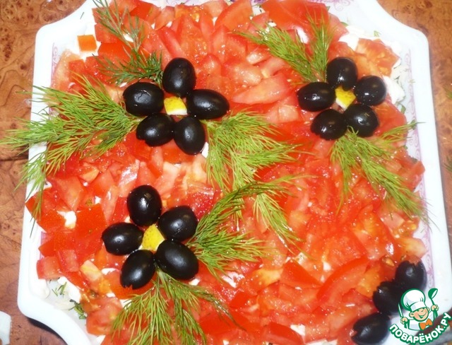 Последний слой помидор. Его порезать и положить на несколько минут в дуршлаг, чтобы лишний сок стек. Затем перекладываем в салатник и украшаем маслинами.