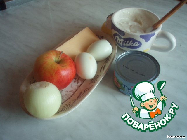Яблоко почистить , потереть на крупной терке. Если сильно сочное, то немного отжать. Дальше действия те же: смешиваем с майонезом и выкладываем поверх яиц. К сожалению этот слой я забыла сфоткать.