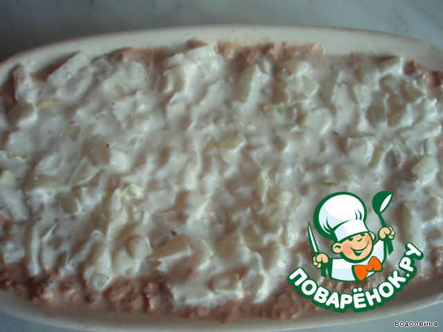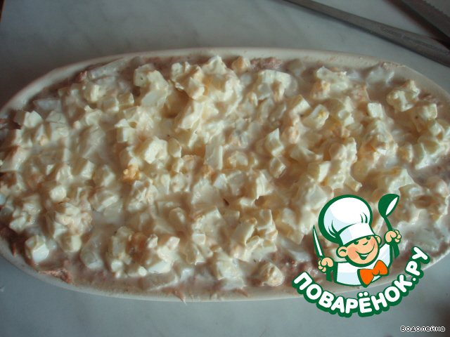 Дальше поступаем так же, как и с рыбой, смешиваем с майонезом и выкладываем на слой тунца.