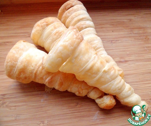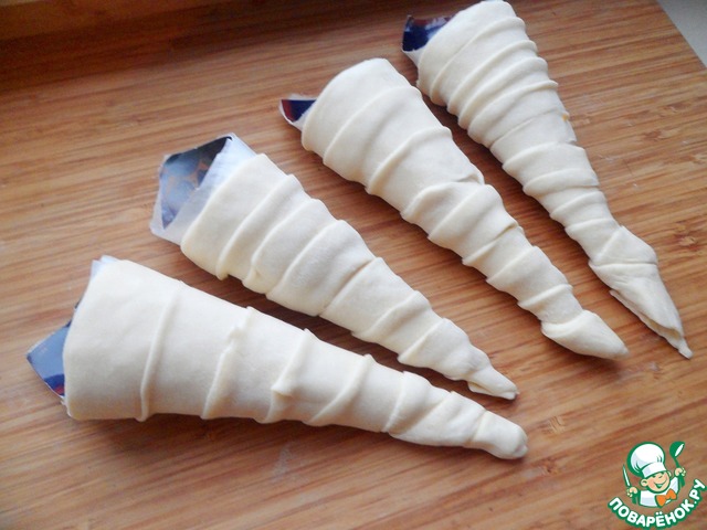 У меня нет специальных форм для выпечки конусов, я их сделала из картона, сверху степлером прикрепить бумагу для выпечки. Раскатать тесто, нарезать тонкие длинные полоски, которые накручиваем по спирали на наши формочки.
