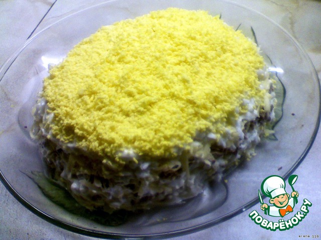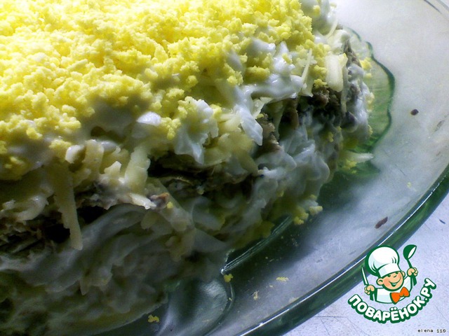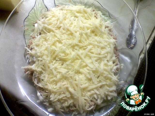 Сверху салат полить майонезом и посыпать натeртыми на самой мелкой тeрке желтками.