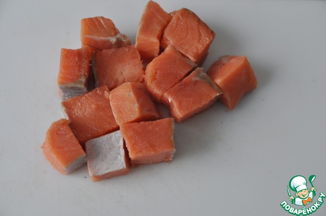 Берём лосось, у меня кижуч, удаляем кости, кожу. Филе режем кубиками.