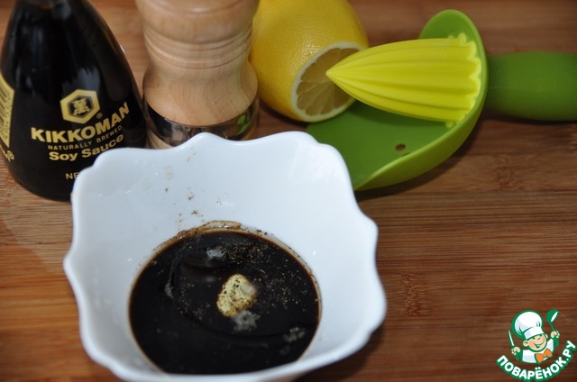 Смешиваем соевый соус, оливковое масло, лимонный сок, свежемолотую смесь перцев.