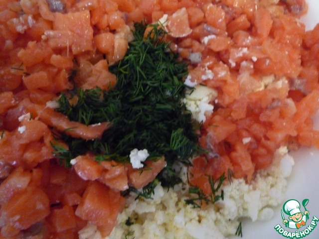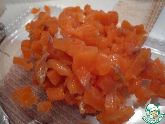 Соленую красную рыбу мело нарезаем. Добавляем к рису и яйцу.