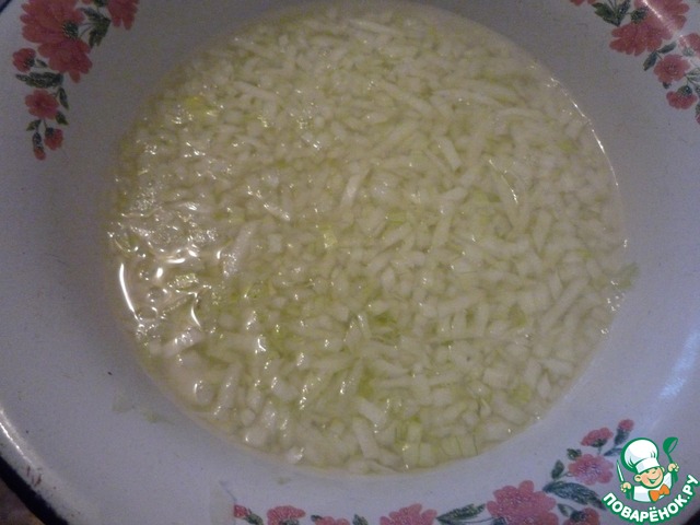 Лук мелко нарезать, залить кипятком и оставить на минут 15.