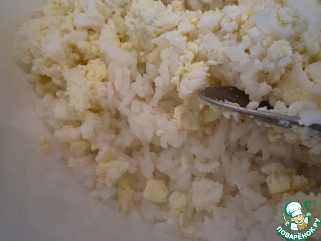 Рис отварить до готовности, остудить. Яйца отварить и мелко нарезать или помять вилкой.