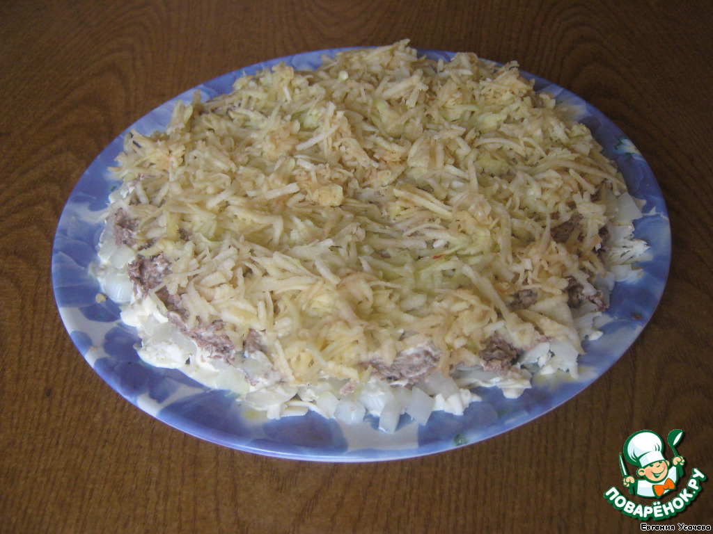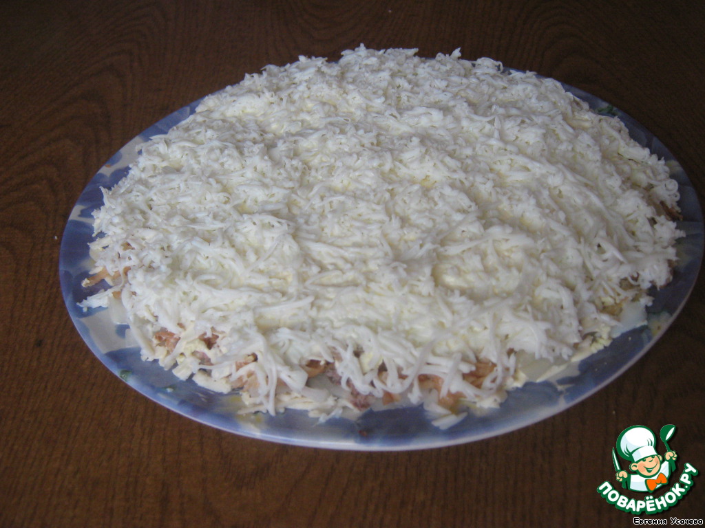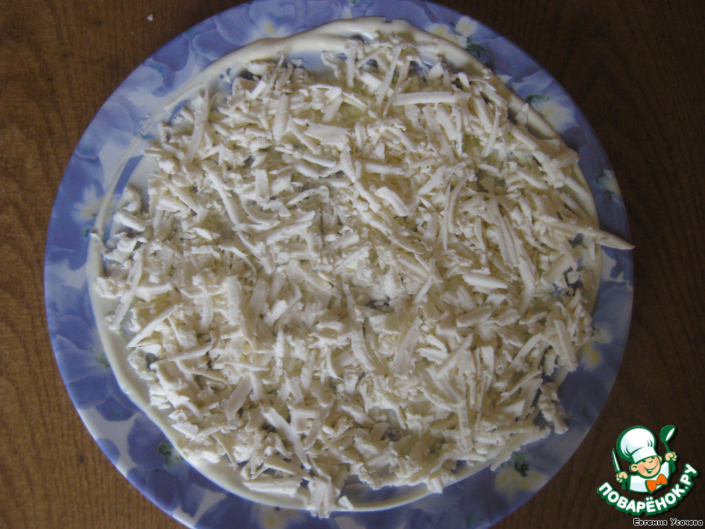 Выкладываем натертый на крупной терке плавленный сыр. Смазываем майонезом.