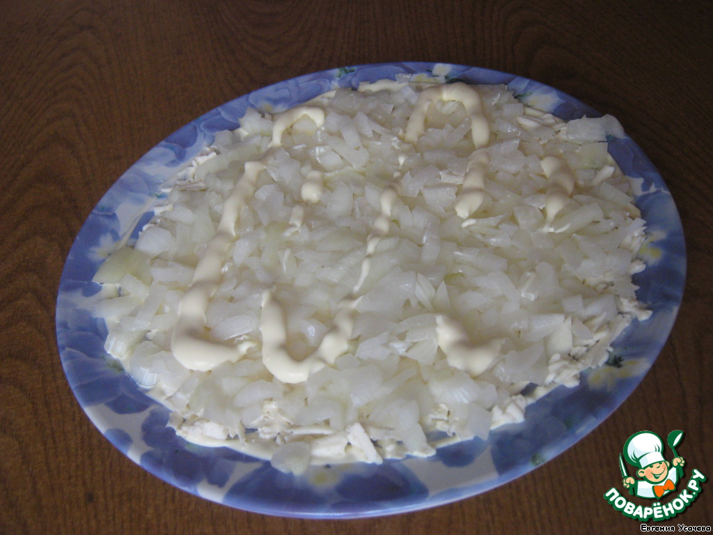 Заранее замаринованный в уксусе лучок выкладываем сверху на сыр. Смазываем майонезом.